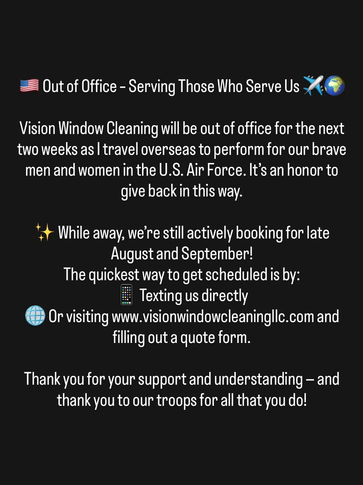 βWe had a great experience with Vision Window Cleaning. Jake was easy to communicate with and did a great job cleaning the windows of our home (which was much needed). Price was very fair. 10/10 would recommend!β